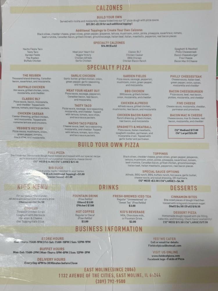 Welcome to Fields of Pizza, your go-to pizzeria located at 1132 Avenue of the Cities in East Moline, IL. We offer a delightful range of traditional and local specialties in a relaxed ambiance perfect for groups or solo diners. Enjoy our quick service for lunch or dinner, with options for dine-in, takeout, and delivery. With an accessible environment, we welcome everyone, including families with children. Indulge in our extensive menu featuring pizzas, craft beers, and mouth-watering desserts. Come experience a taste that satisfies both locals and visitors alike at Fields of Pizza—where deliciousness meets convenience!