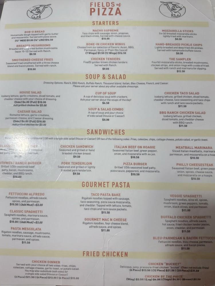 The menu at Fields of Pizza showcases a range of delicious options, from pizzas to salads and sandwiches. The highlight remains the customizable pizza, where diners can choose their crust, toppings, and size. Local favorites include the chicken and sausage, each bursting with flavor.